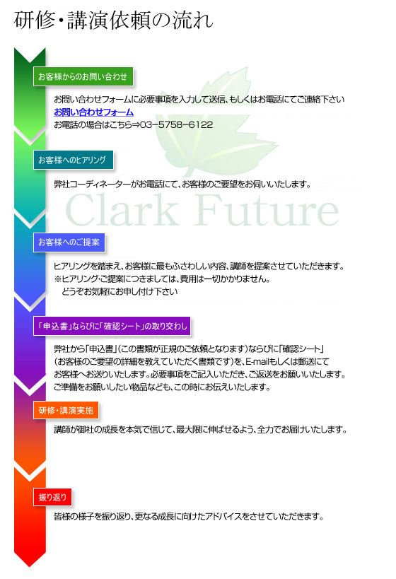 ホスピタリティ(ビジョン再構築、マナー、コミュニケーション、マネジメント、リーダーシップ、サービス等)をテーマとした研修をお受けしております。 研修規模も、10名〜30名前後まで、お客様のニーズやご予算に合わせて内容をカスタマイズさせていただきます。お気軽にお問い合わせ下さい。